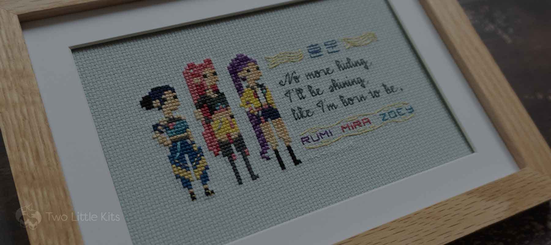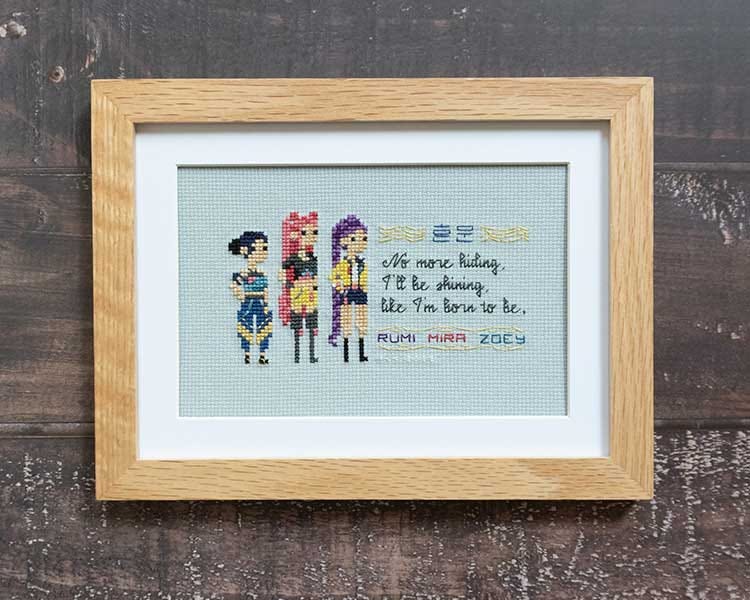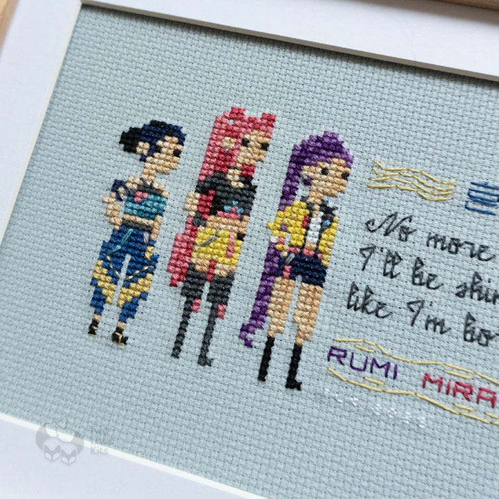 So of course, it was only a matter of time before I turned that inspiration into stitches. My newest cross-stitch pattern, “No Hiding”, features Rumi, Mira, and Zoey in their amazing movie outfits, with yellow-gold Honmoon barriers that protects the human world from demons. The quote “No more hiding, I’ll be shining, like I’m born to be” is front and centre — such a perfect line about self-expression and confidence.
